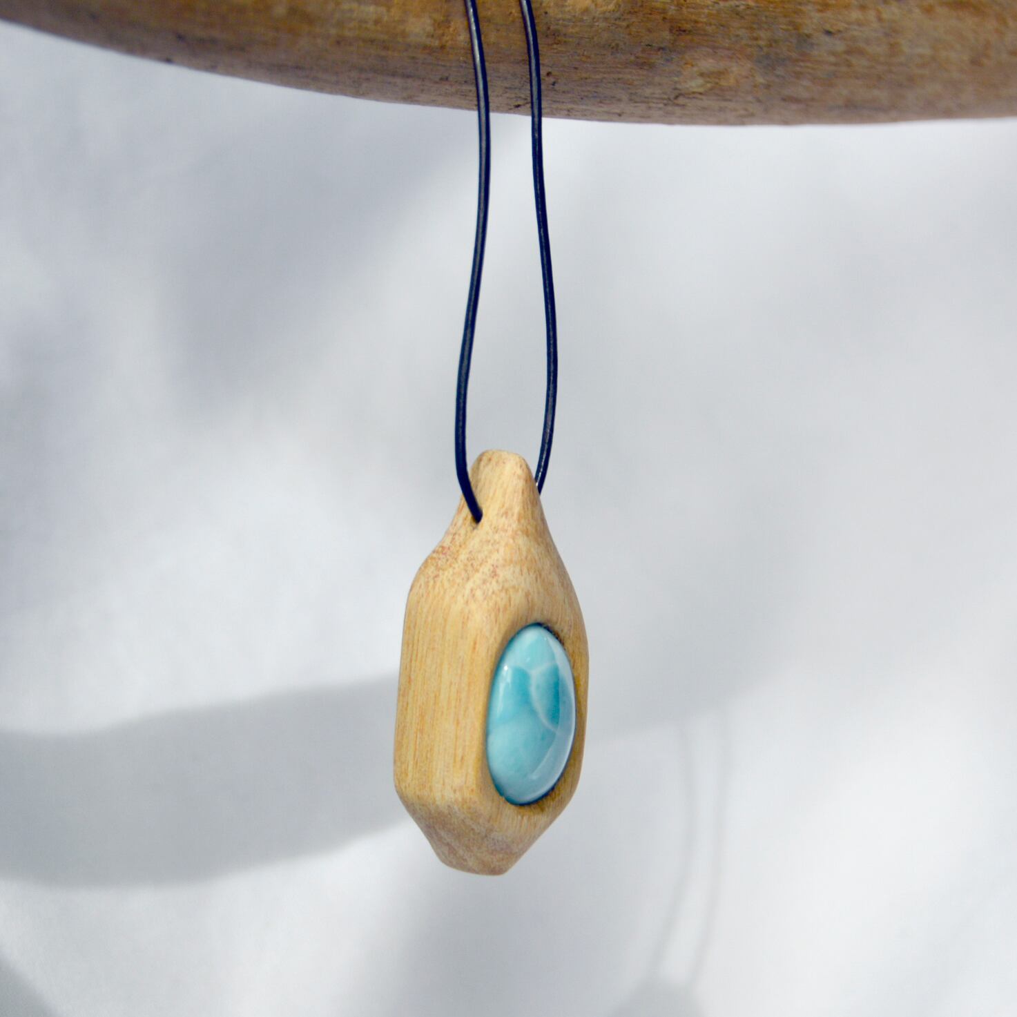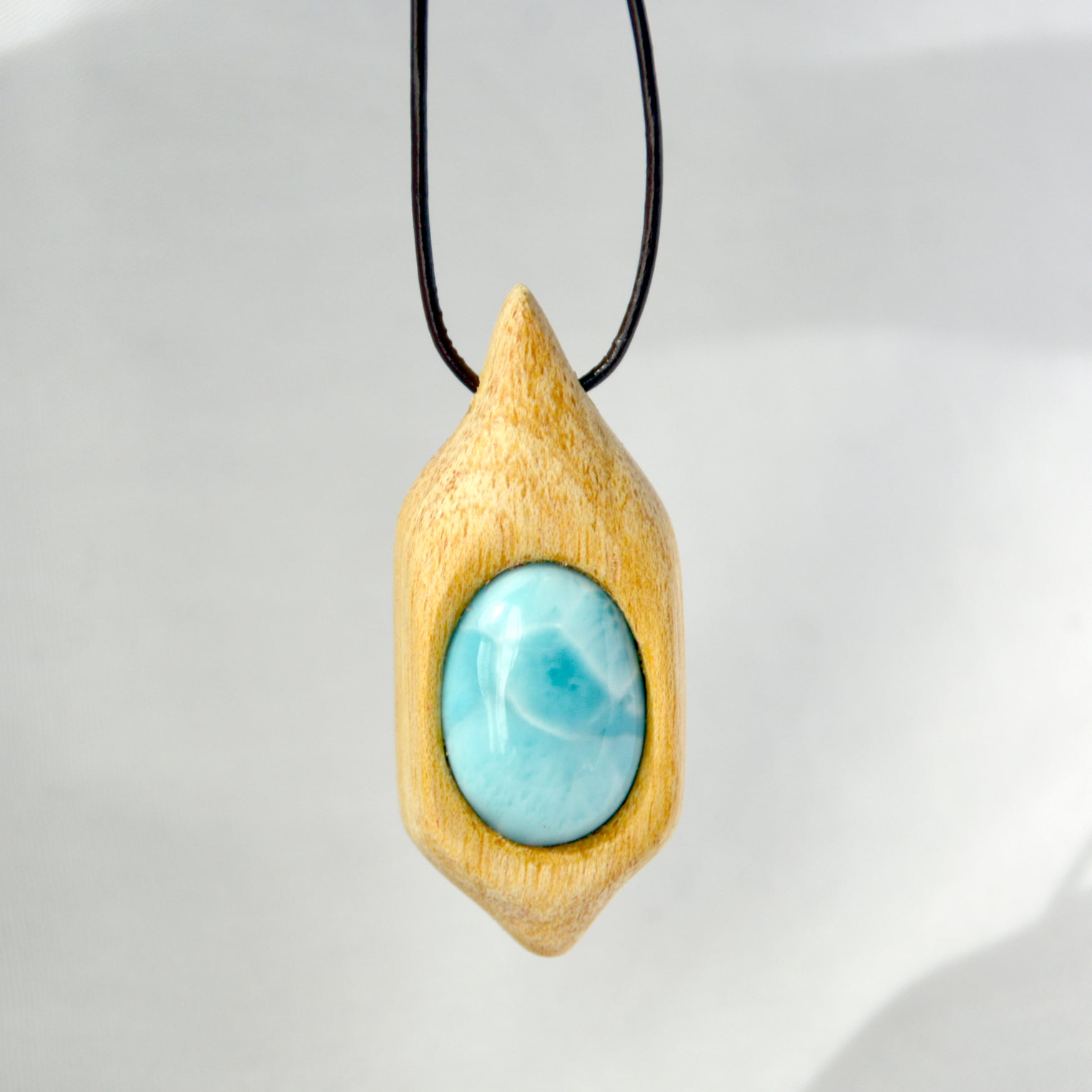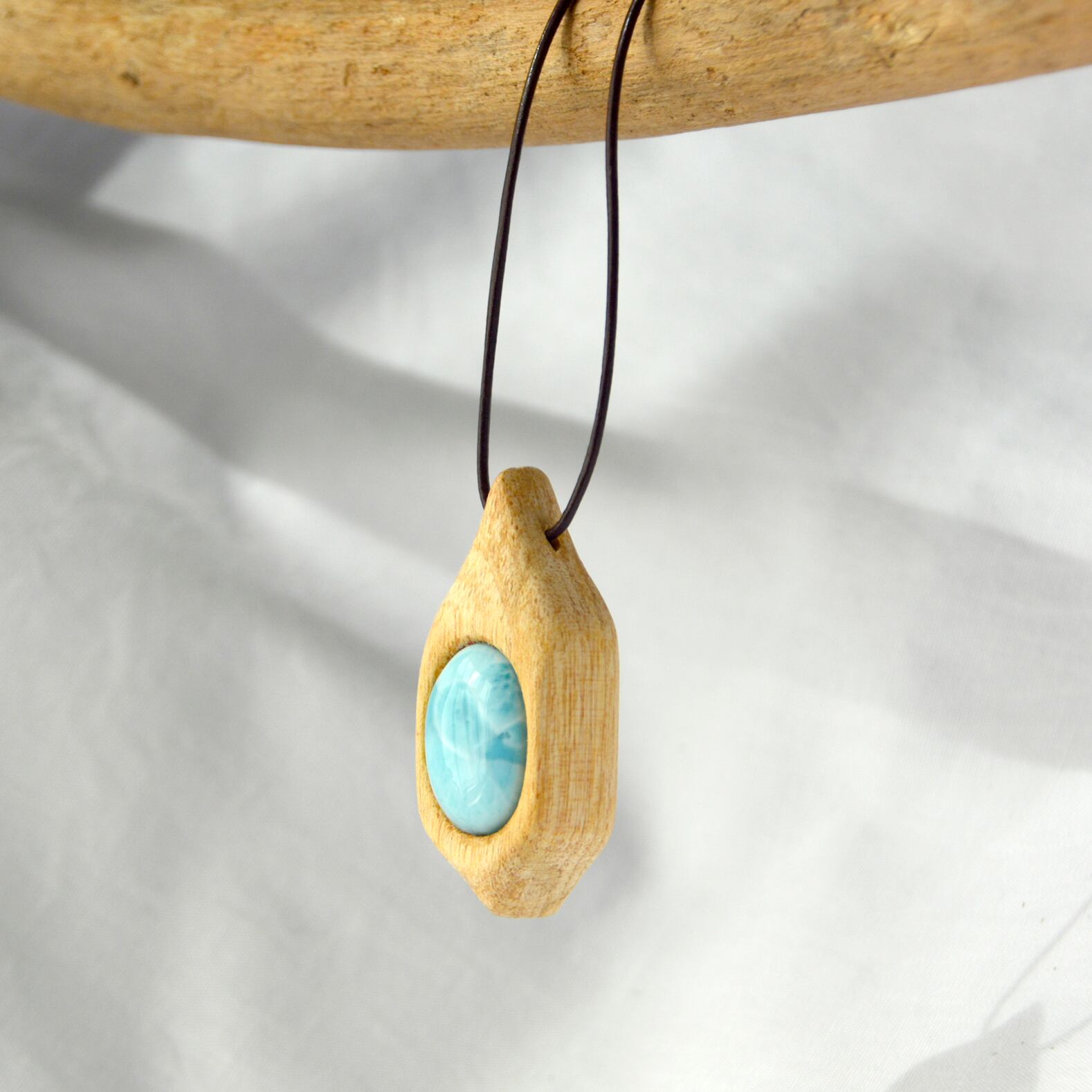透明感のある美しい水色のラリマーは、まるで海のような色合いを持ち、パロサントの温かみと見事に調和しています。