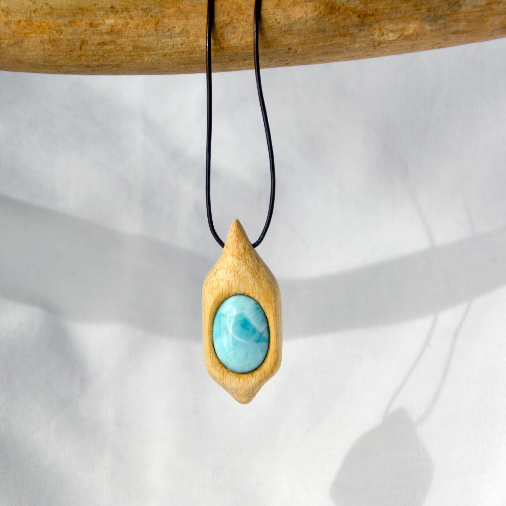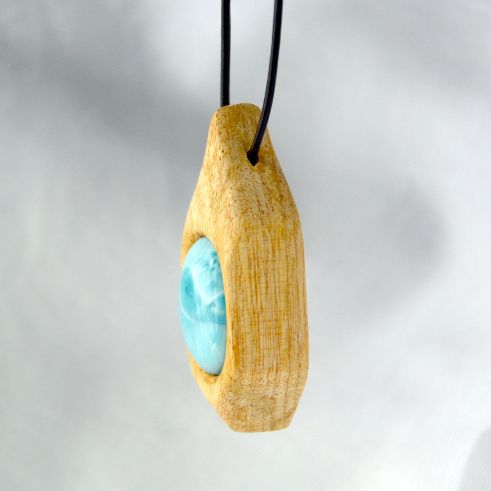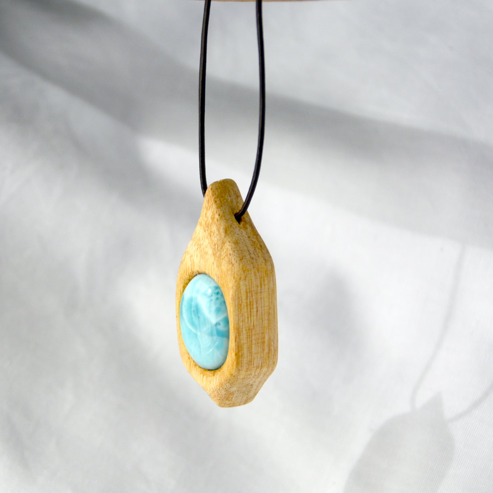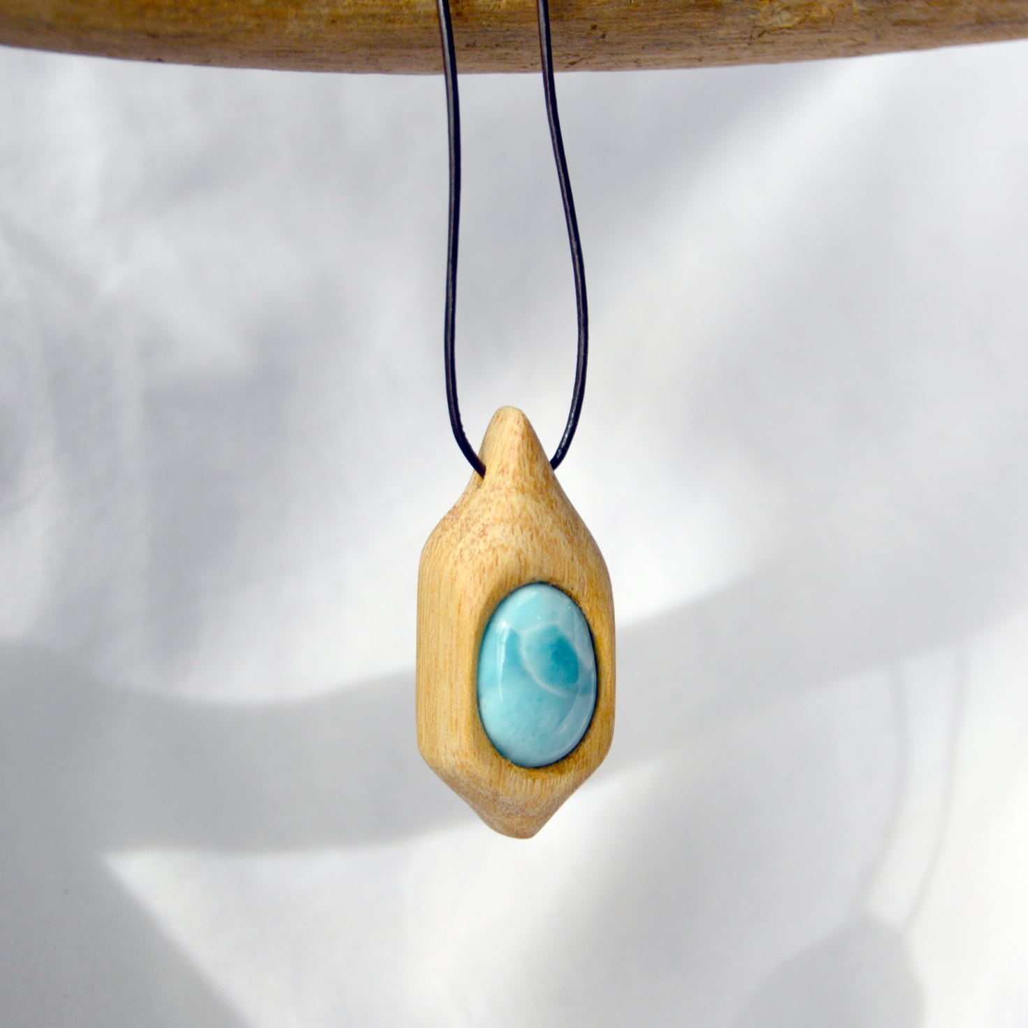 透明感のある美しい水色のラリマーは、まるで海のような色合いを持ち、パロサントの温かみと見事に調和しています。