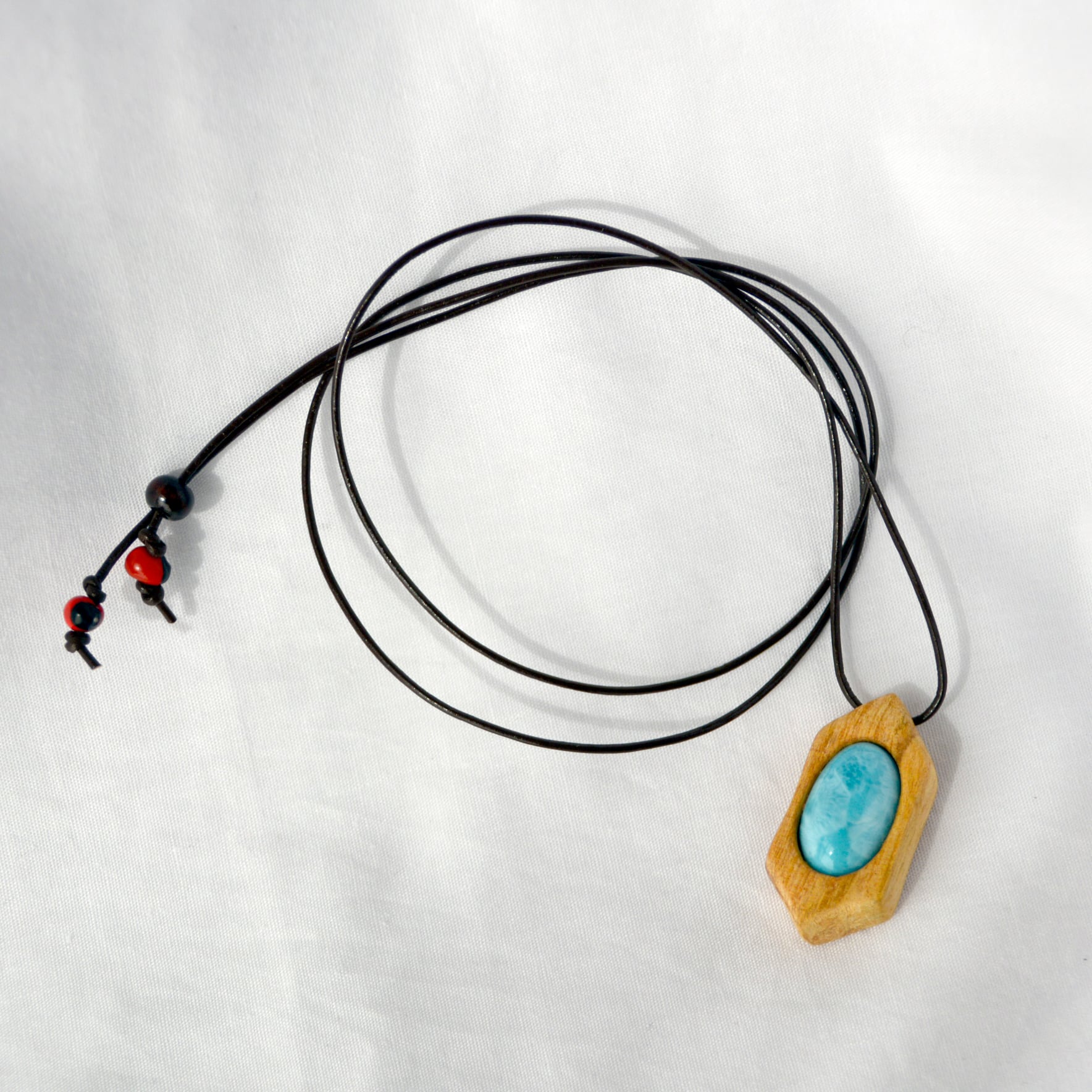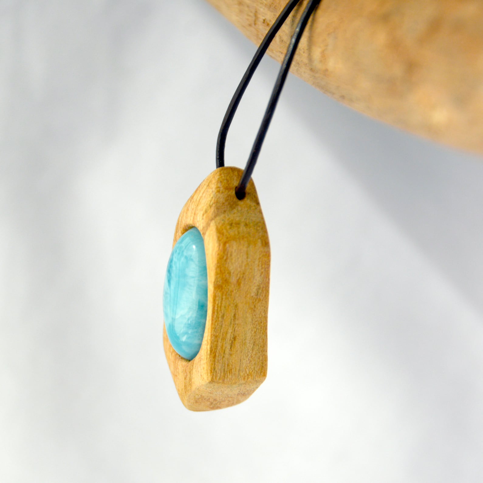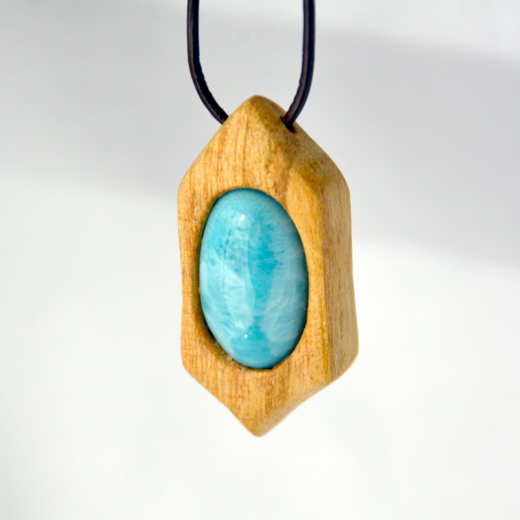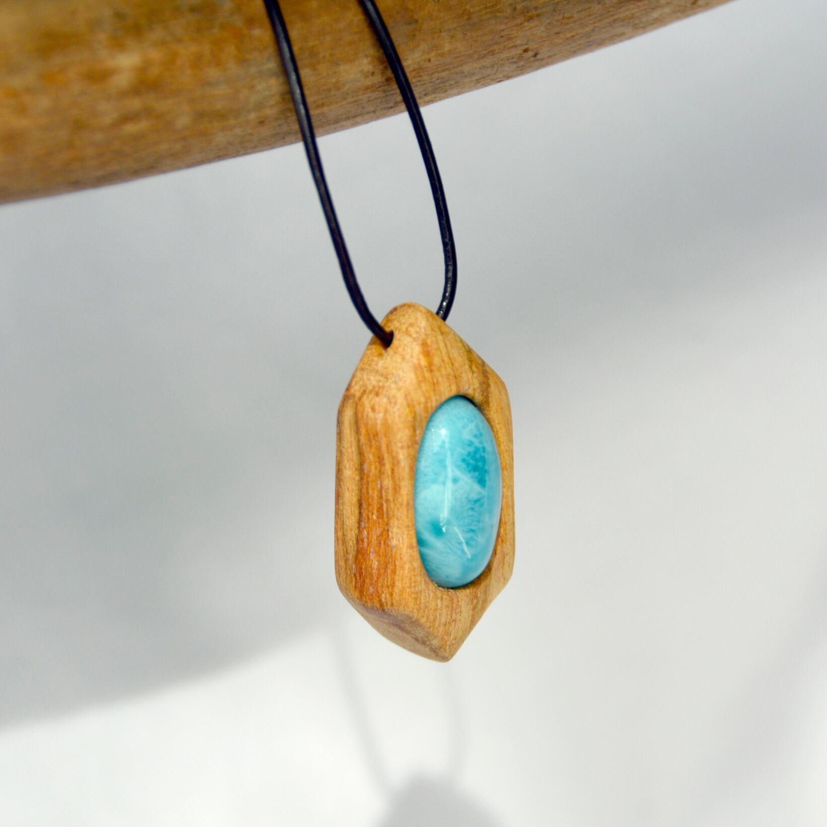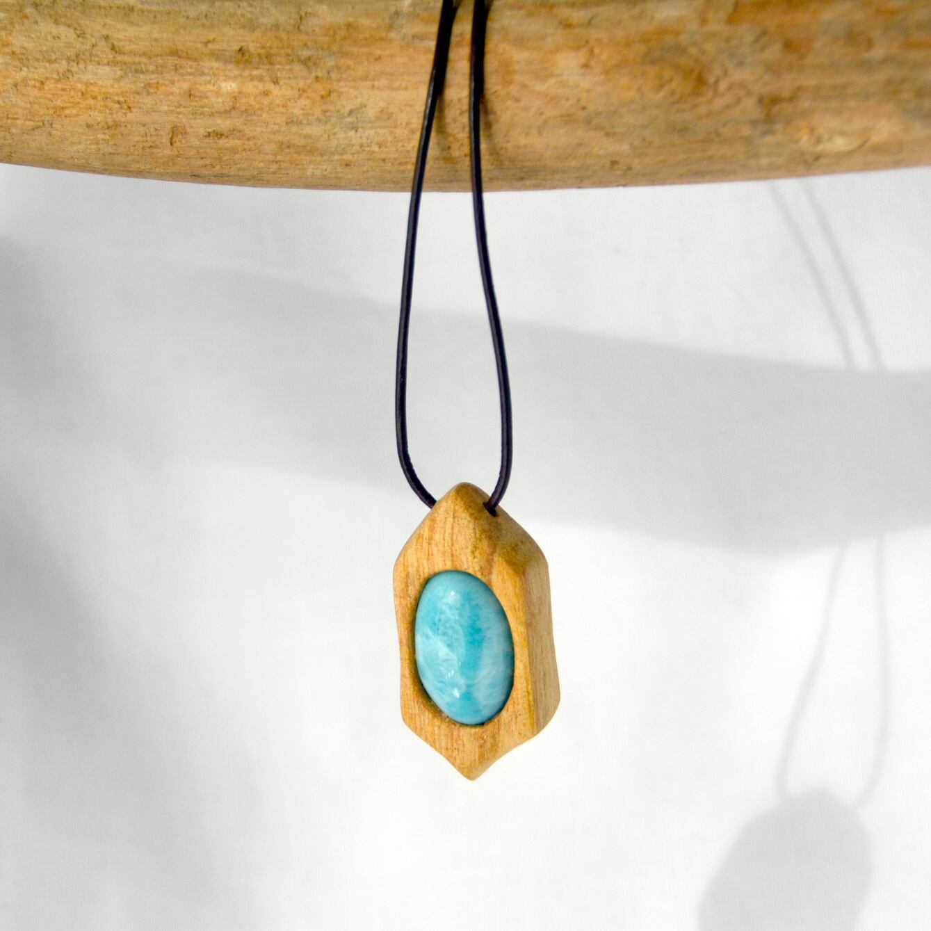 透明感のある美しい水色のラリマーは、まるで海のような色合いを持ち、パロサントの温かみと見事に調和しています。