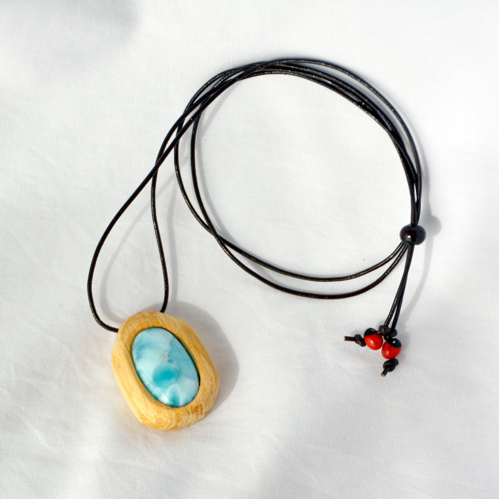スペイン語で「聖なる木」と呼ばれるパロサントと、存在感のあるラリマーそしてワイルーロの実を組み合わせた、美しいネックレスの登場です。