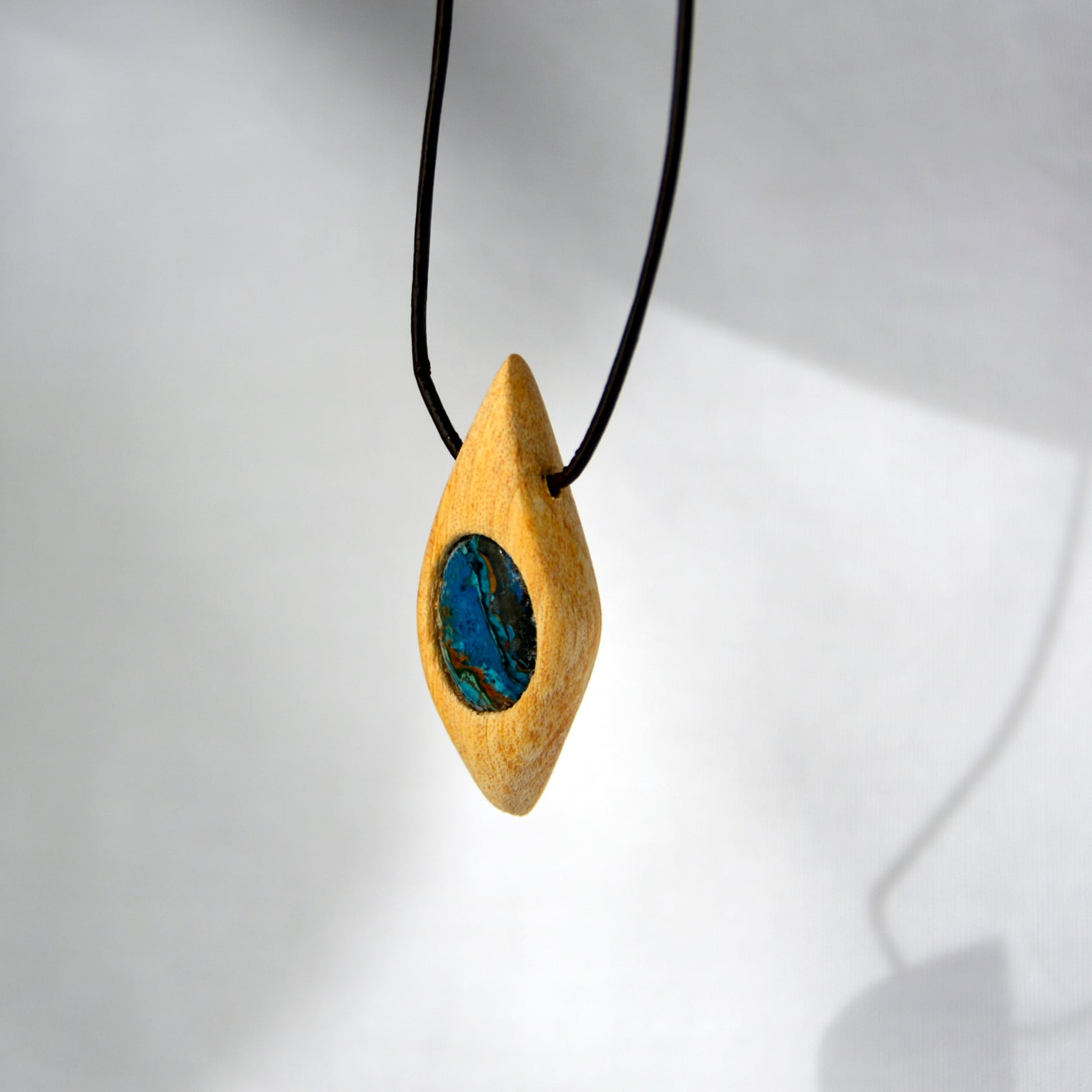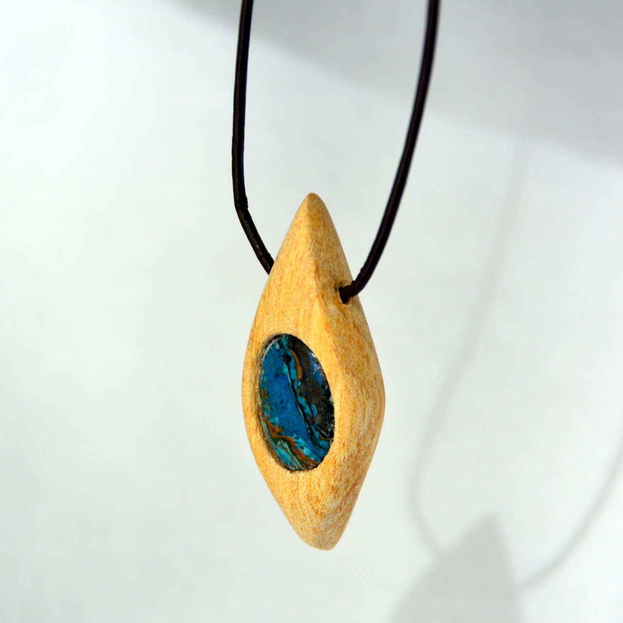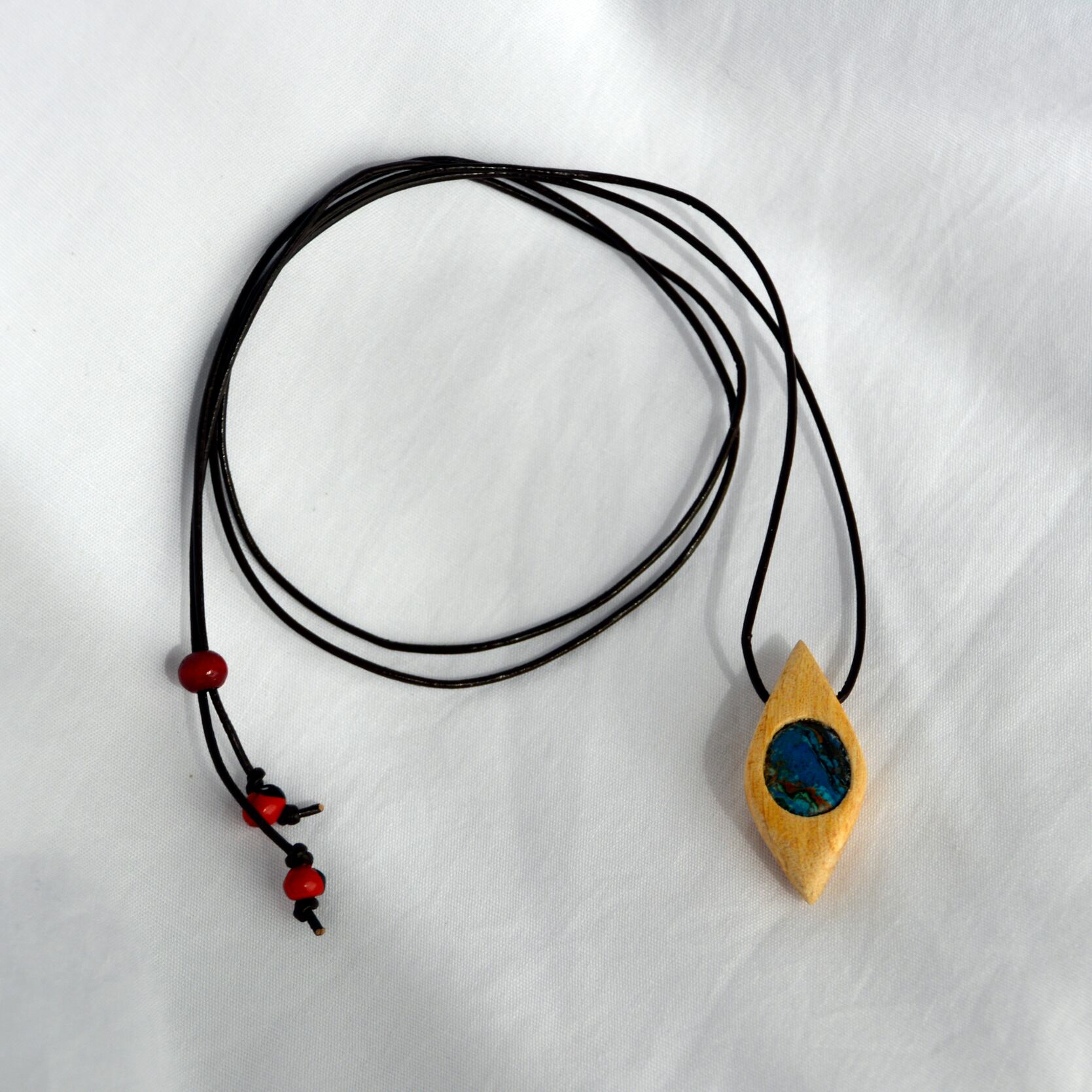スペイン語で「聖なる木」と呼ばれるパロサントに、魅力的なレインボーカルシリカとワイルーロの実を組み合わせた、珍しい一点物のネックレスです。