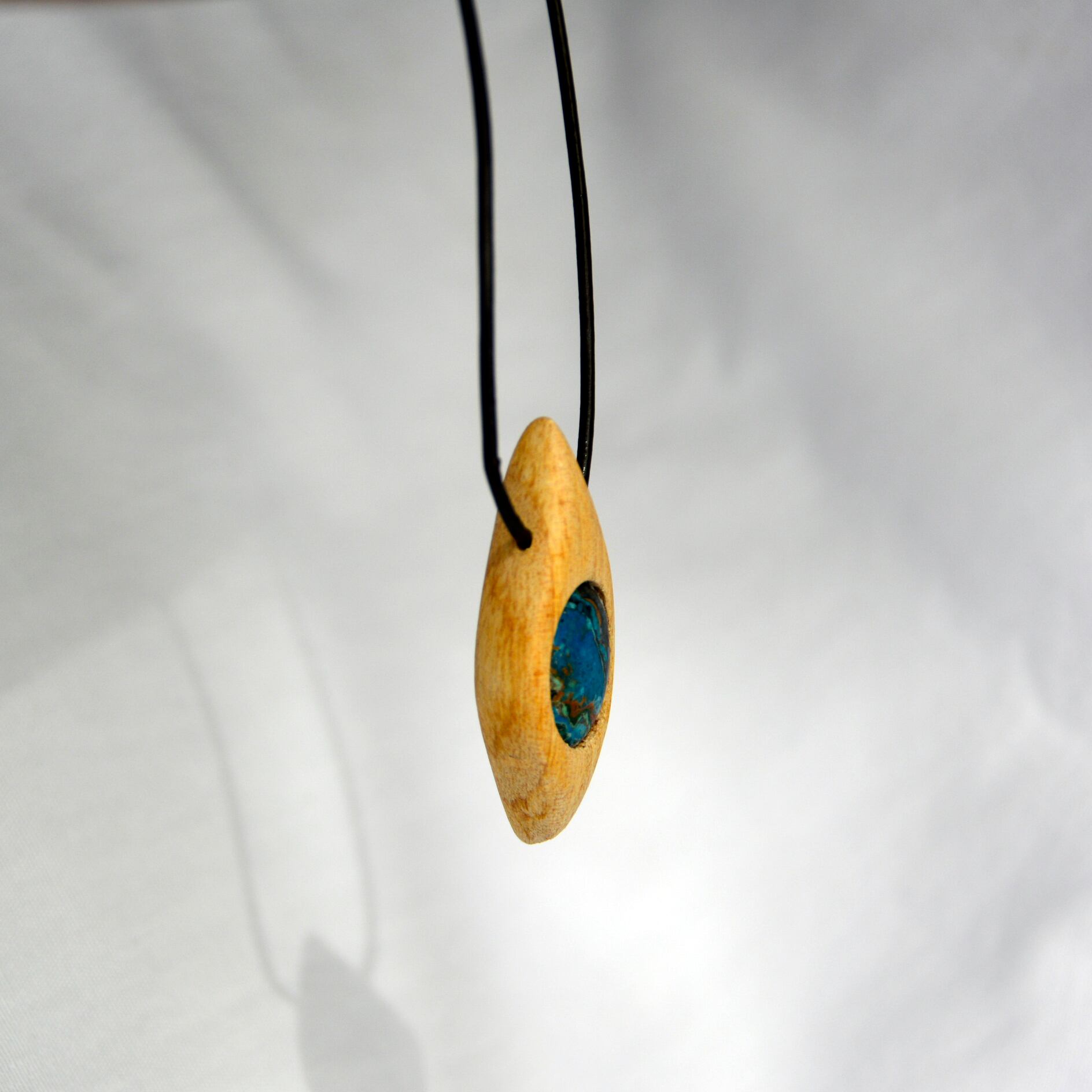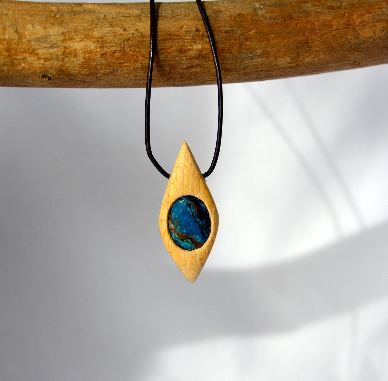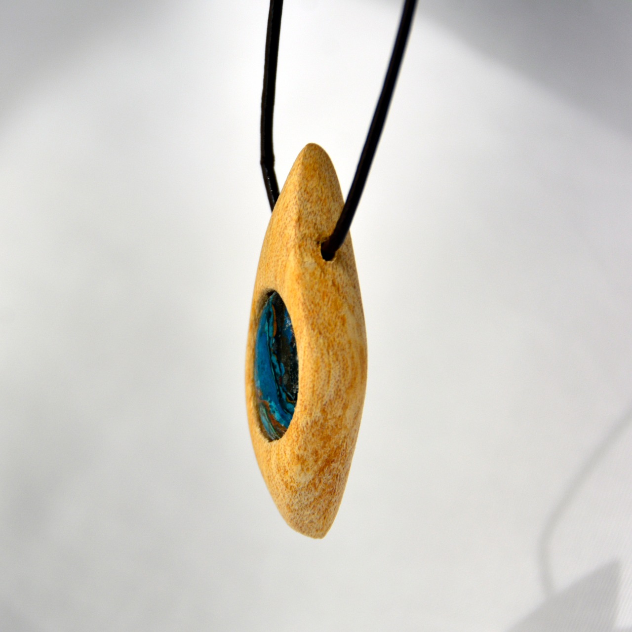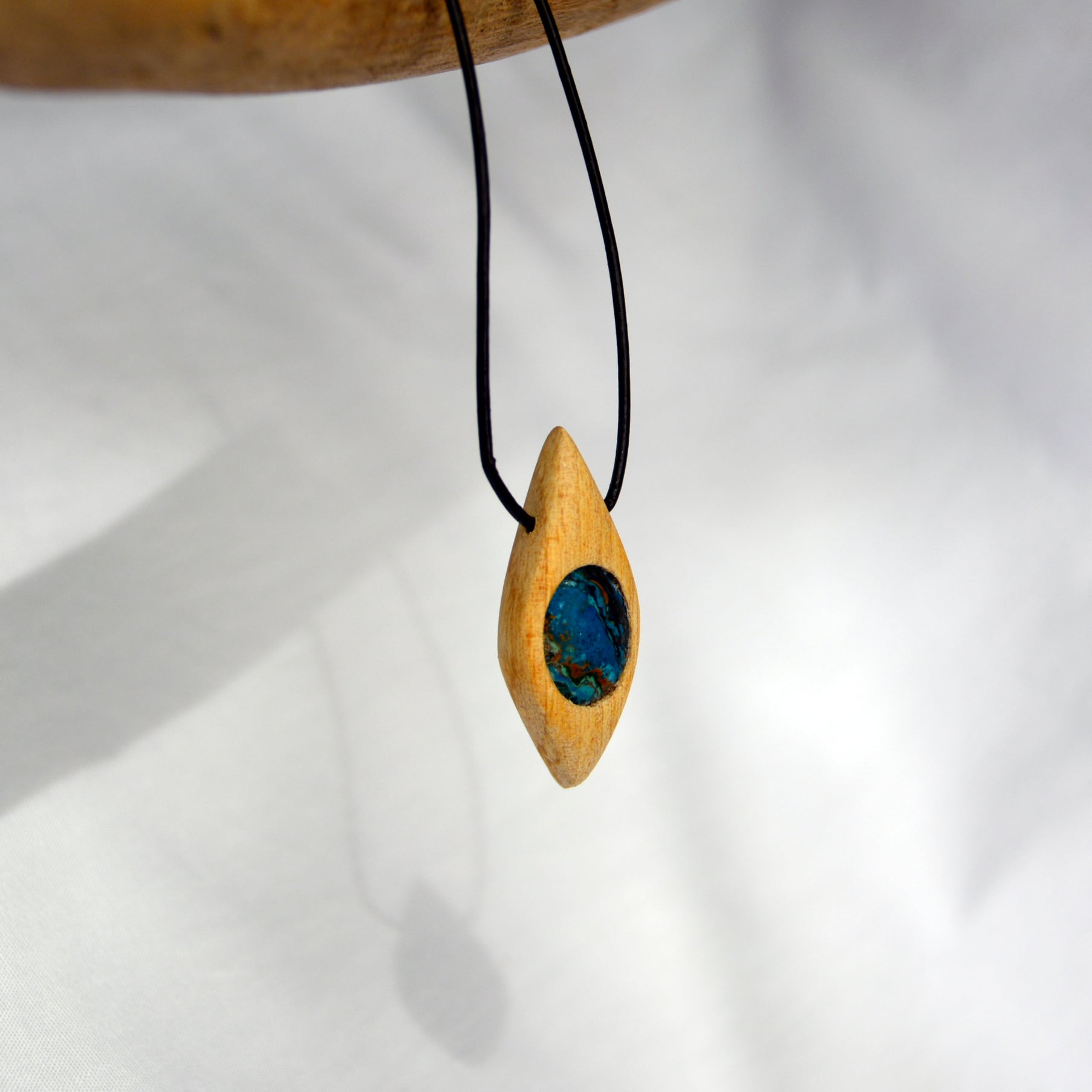 スペイン語で「聖なる木」と呼ばれるパロサントに、魅力的なレインボーカルシリカとワイルーロの実を組み合わせた、珍しい一点物のネックレスです。